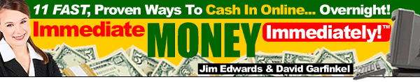 This is your invitation to join us on the Now that you see we actually practice what we preach and we rank among the most successful at providing easy-to-understand techniques that other people can (and do) use to make money online themselves, let's get down to brass tacks: what's in this book? We start with 11 techniques. I'll be the first one to tell you that you've heard of some of these methods before. But I may be the only one to say flat out that most people are "in the dark" about exactly how to use them. That's where "Immediate Money Immediately" sets itself apart from the great mass of other Internet marketing "fluff". We don't require any guesswork on your part or leave anything to chance. We show you in exact detail - with real-life illustrations and examples - what to do! There are complete explanations - in plain, ordinary language - of the fine points that spell the difference between success and failure in marketing on the Web, including many sets of step-by-step instructions. We also place a high priority on things that cost little or nothing to develop or implement. This book is the "blueprint" you've been looking for for making money online without spending money to do it! Read just the first section and you'll know...